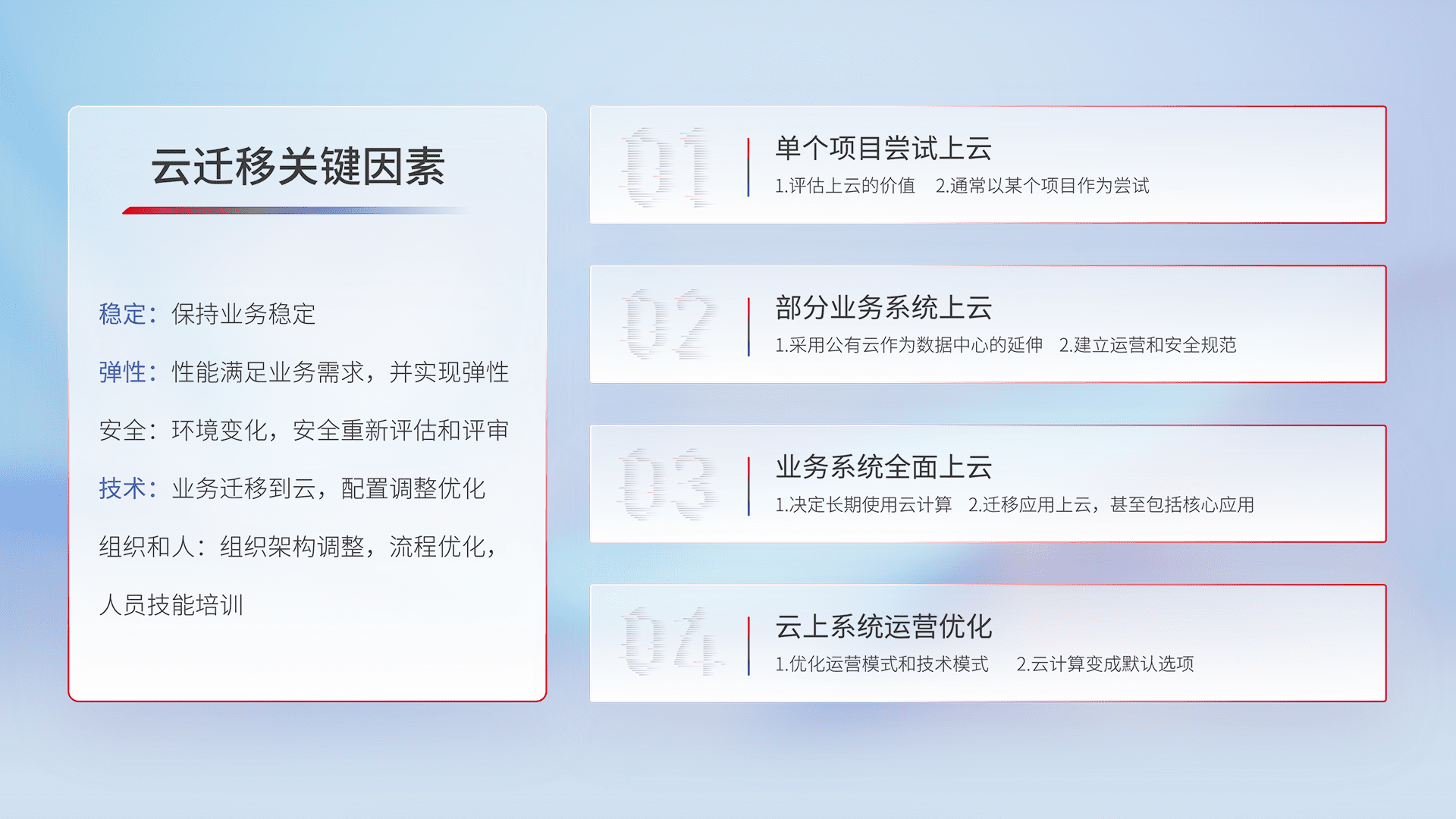 结合实际业务,,,从规划设计、、云平台选型、、、、云原生改造、、、数据迁移、、、、集成交付,,迁移全过程为客户识别最佳上云路径,,,做好风险识别管理,,,,设计网络架构、、、、身份权限、、安全审计合规、、、、操作审计、、、、日志审计、、监控告警策略、、多站点容灾设计等,,对云上基础设施进行整体规划,,提升IT治理水平,,以满足弹性、、、、高可用、、高性能的需求。。。。