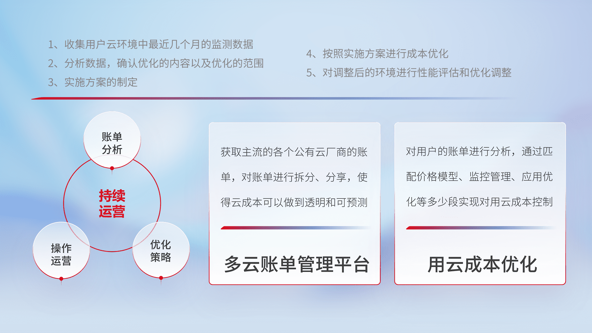 通过多云纳管,,以统一的资源数据模型把客户的云资源进行抽象和封装,,进而实现对多云资源的统一操作,,,,保障云资源管理的可靠性、、、稳定性与可用性。。。量身定制化运维内容,,,配置、、、开发运维、、补丁管理、、、、备份、、监控、、认证和访问管理、、、、审计和日常巡检等,,,保障在用云过程中的可靠度,,,稳定度以及高可用率。。